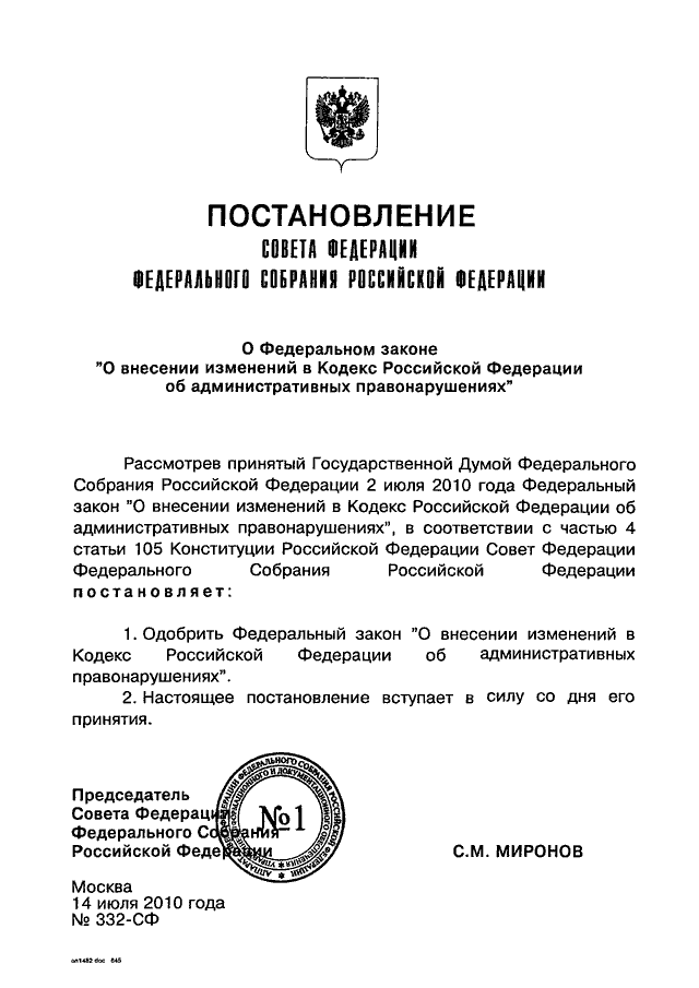 ПОСТАНОВЛЕНИЕ СФ ФС РФ от 14.07.2010 N 332-СФ