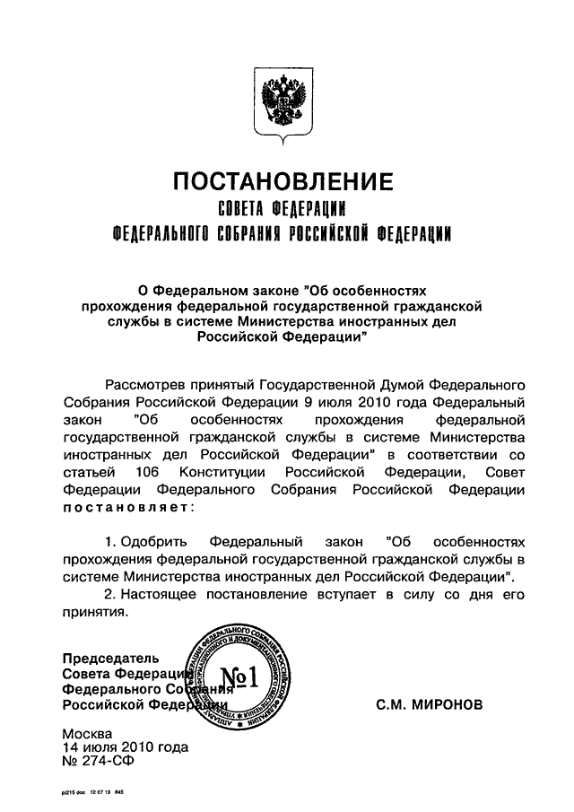 ПОСТАНОВЛЕНИЕ СФ ФС РФ от 14.07.2010 N 274-СФ
