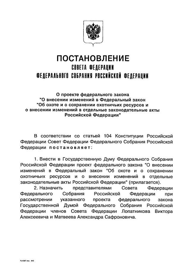 "О ПРОЕКТЕ ФЕДЕРАЛЬНОГО ЗАКОНА "О ВНЕСЕНИИ ИЗМЕНЕНИЙ В ФЕДЕРАЛЬНЫЙ ЗАКОН "ОБ ОХОТЕ И О СОХРАНЕНИИ ОХОТНИЧЬИХ РЕСУРСОВ И О ВНЕСЕНИИ ИЗМЕНЕНИЙ В ОТДЕЛЬНЫЕ ЗАКОНОДАТЕЛЬНЫЕ АКТЫ РОССИЙСКОЙ ФЕДЕРАЦИИ"