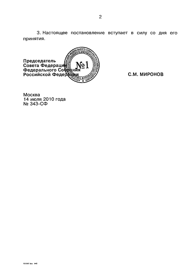 ПОСТАНОВЛЕНИЕ СФ ФС РФ от 14.07.2010 N 343-СФ