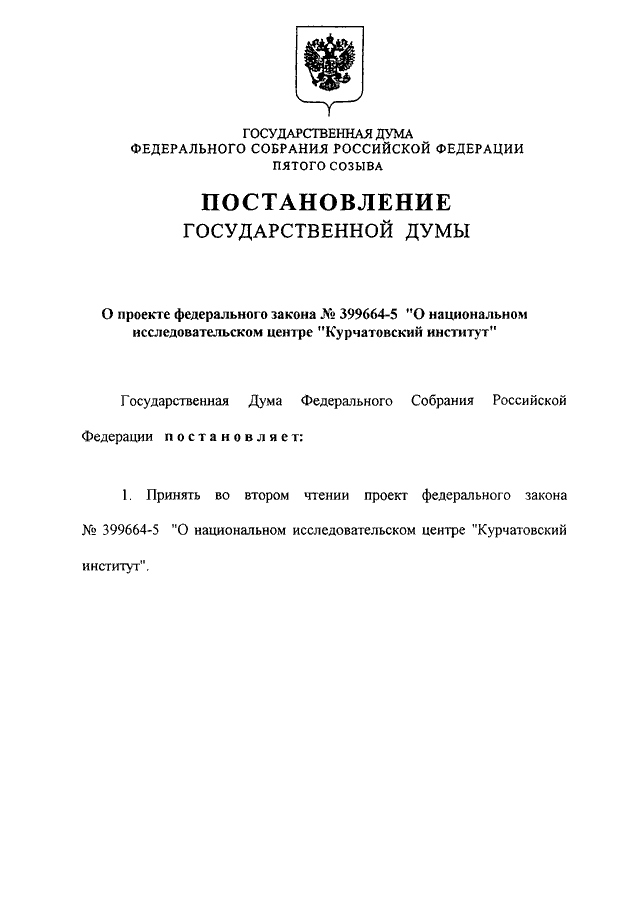 "О ПРОЕКТЕ ФЕДЕРАЛЬНОГО ЗАКОНА N 399664-5 "О НАЦИОНАЛЬНОМ ИССЛЕДОВАТЕЛЬСКОМ ЦЕНТРЕ "КУРЧАТОВСКИЙ ИНСТИТУТ"