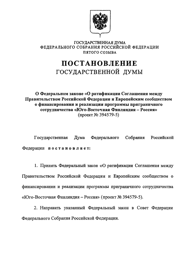 "О ФЕДЕРАЛЬНОМ ЗАКОНЕ "О РАТИФИКАЦИИ СОГЛАШЕНИЯ МЕЖДУ ПРАВИТЕЛЬСТВОМ РОССИЙСКОЙ ФЕДЕРАЦИИ И ЕВРОПЕЙСКИМ СООБЩЕСТВОМ О ФИНАНСИРОВАНИИ И РЕАЛИЗАЦИИ ПРОГРАММЫ ПРИГРАНИЧНОГО СОТРУДНИЧЕСТВА "ЮГО - ВОСТОЧНАЯ ФИНЛЯНДИЯ - РОССИЯ" (ПРОЕКТ N 394579-5)"