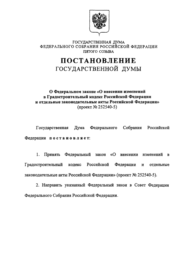 "О ФЕДЕРАЛЬНОМ ЗАКОНЕ "О ВНЕСЕНИИ ИЗМЕНЕНИЙ В ГРАДОСТРОИТЕЛЬНЫЙ КОДЕКС РОССИЙСКОЙ ФЕДЕРАЦИИ И ОТДЕЛЬНЫЕ ЗАКОНОДАТЕЛЬНЫЕ АКТЫ РОССИЙСКОЙ ФЕДЕРАЦИИ" (ПРОЕКТ N 252540-5)"