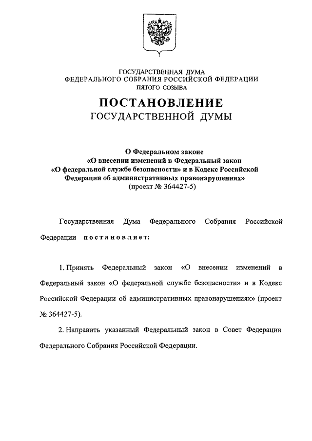 "О ФЕДЕРАЛЬНОМ ЗАКОНЕ "О ВНЕСЕНИИ ИЗМЕНЕНИЙ В ФЕДЕРАЛЬНЫЙ ЗАКОН "О ФЕДЕРАЛЬНОЙ СЛУЖБЕ БЕЗОПАСНОСТИ" И В КОДЕКС РОССИЙСКОЙ ФЕДЕРАЦИИ ОБ АДМИНИСТРАТИВНЫХ ПРАВОНАРУШЕНИЯХ" (ПРОЕКТ N 364427-5)"