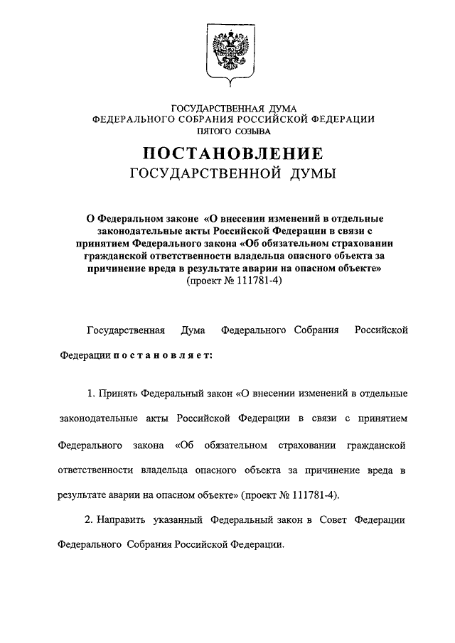 ЗАКОНОДАТЕЛЬНЫЕ АКТЫ РОССИЙСКОЙ ФЕДЕРАЦИИ В СВЯЗИ С ПРИНЯТИЕМ