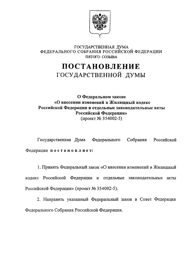 "О ФЕДЕРАЛЬНОМ ЗАКОНЕ "О ВНЕСЕНИИ ИЗМЕНЕНИЙ В ЖИЛИЩНЫЙ КОДЕКС РОССИЙСКОЙ ФЕДЕРАЦИИ И ОТДЕЛЬНЫЕ ЗАКОНОДАТЕЛЬНЫЕ АКТЫ РОССИЙСКОЙ ФЕДЕРАЦИИ" (ПРОЕКТ N 354002-5)"