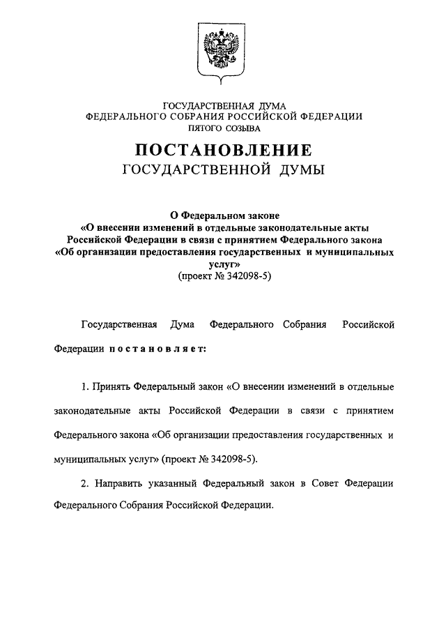 "О ФЕДЕРАЛЬНОМ ЗАКОНЕ "О ВНЕСЕНИИ ИЗМЕНЕНИЙ В ОТДЕЛЬНЫЕ ЗАКОНОДАТЕЛЬНЫЕ АКТЫ РОССИЙСКОЙ ФЕДЕРАЦИИ В СВЯЗИ С ПРИНЯТИЕМ ФЕДЕРАЛЬНОГО ЗАКОНА "ОБ ОРГАНИЗАЦИИ ПРЕДОСТАВЛЕНИЯ ГОСУДАРСТВЕННЫХ И МУНИЦИПАЛЬНЫХ УСЛУГ" (ПРОЕКТ N 342098-5)"