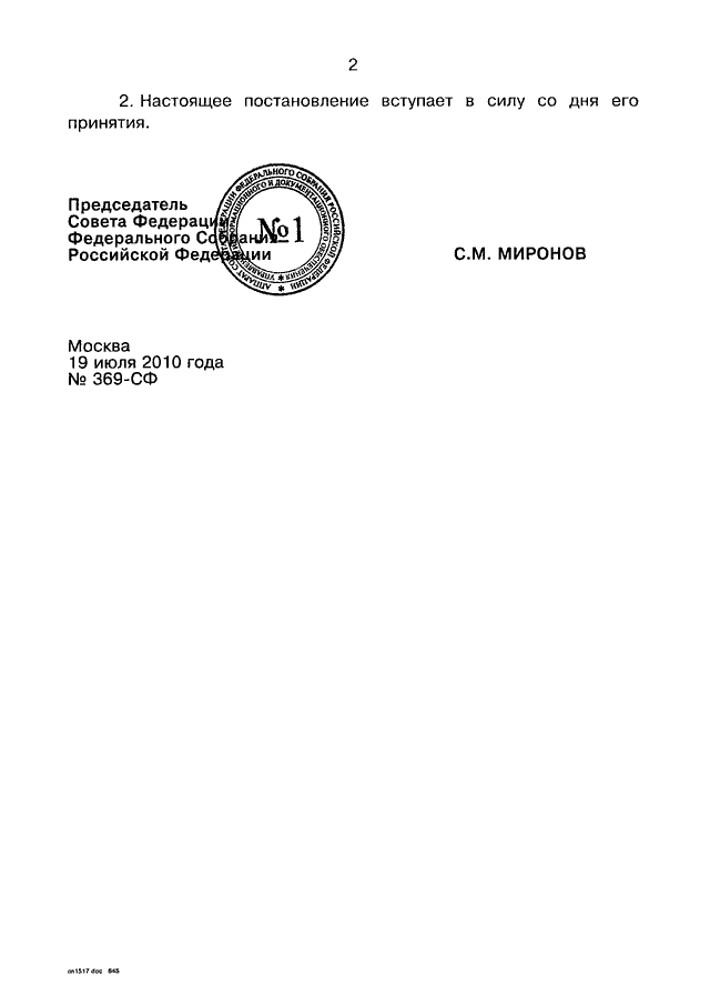 ПОСТАНОВЛЕНИЕ СФ ФС РФ от 19.07.2010 N 369-СФ