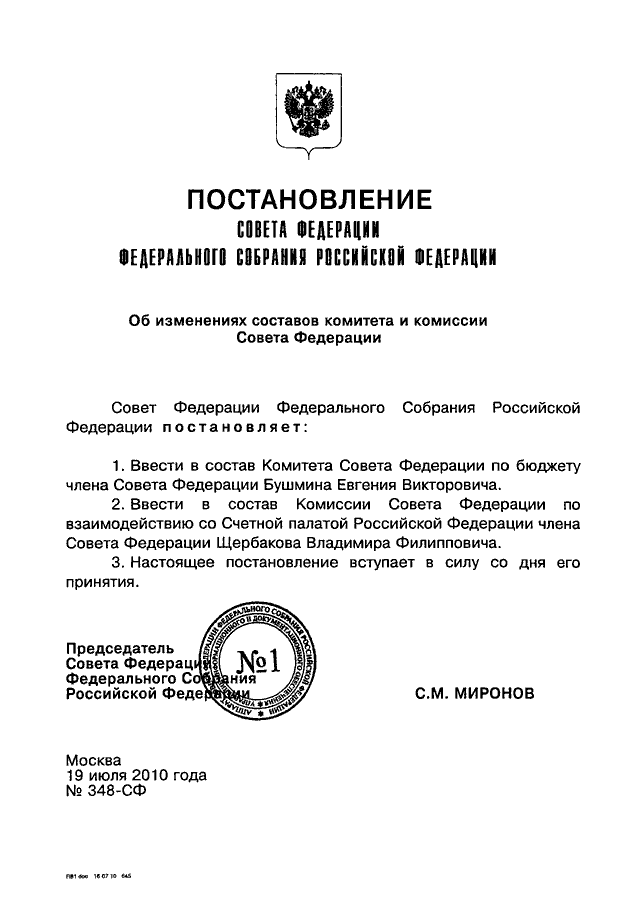 ПОСТАНОВЛЕНИЕ СФ ФС РФ от 19.07.2010 N 348-СФ