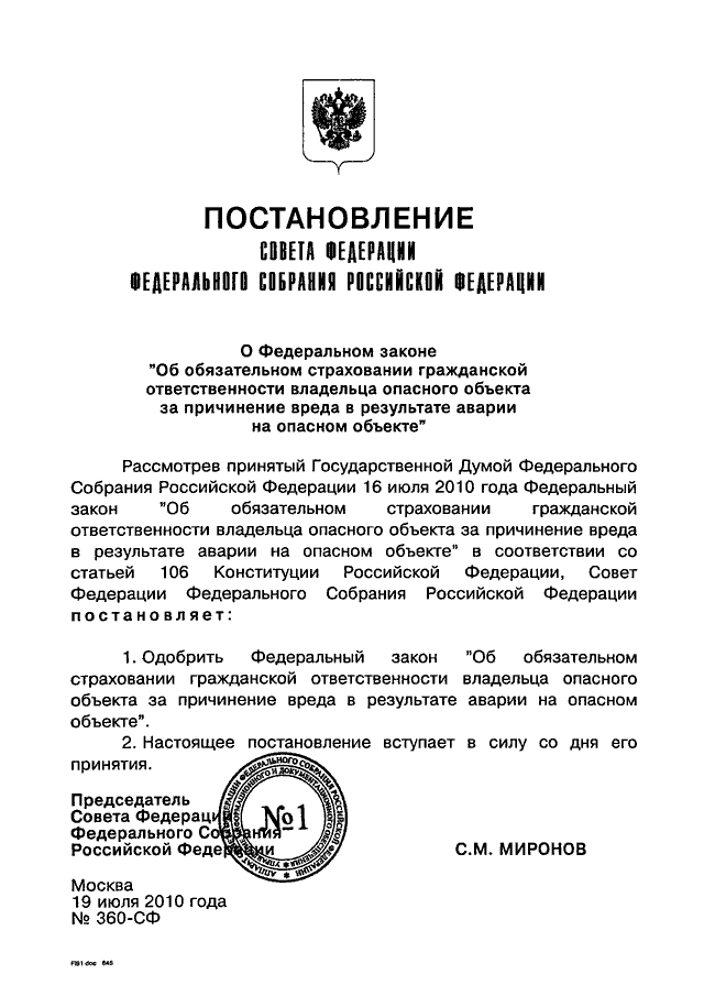 ПОСТАНОВЛЕНИЕ СФ ФС РФ от 19.07.2010 N 360-СФ