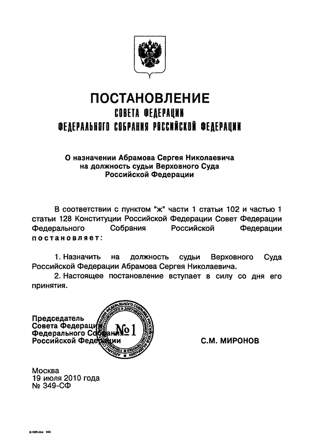 ПОСТАНОВЛЕНИЕ СФ ФС РФ от 19.07.2010 N 349-СФ