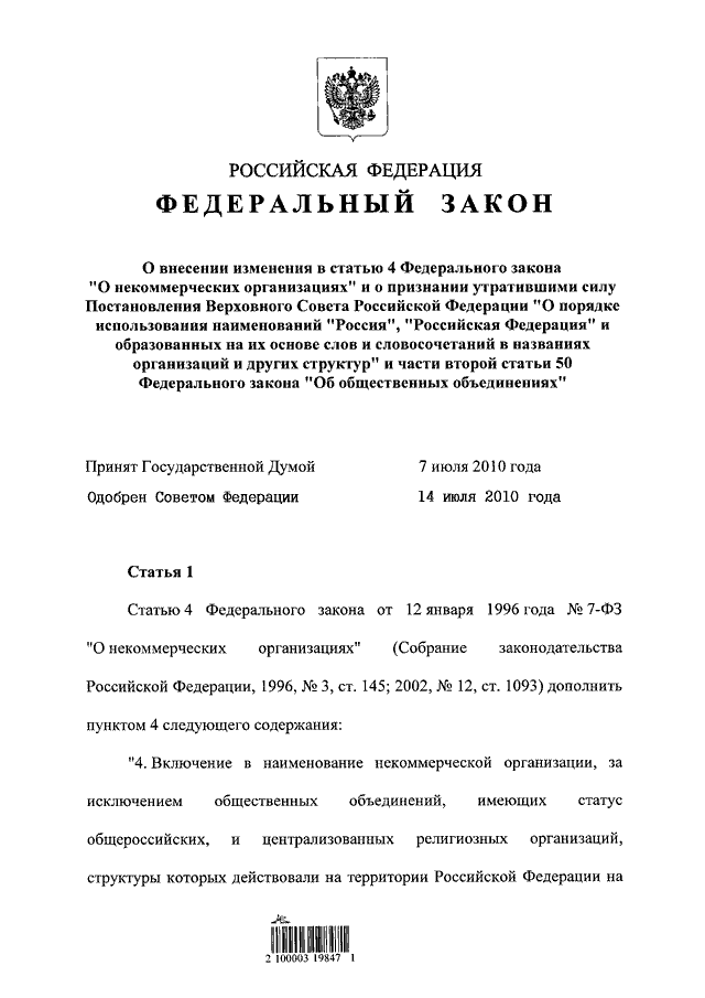 "О ВНЕСЕНИИ ИЗМЕНЕНИЯ В СТАТЬЮ 4 ФЕДЕРАЛЬНОГО ЗАКОНА "О НЕКОММЕРЧЕСКИХ ОРГАНИЗАЦИЯХ" И О ПРИЗНАНИИ УТРАТИВШИМИ СИЛУ ПОСТАНОВЛЕНИЯ ВЕРХОВНОГО СОВЕТА РОССИЙСКОЙ ФЕДЕРАЦИИ "О ПОРЯДКЕ ИСПОЛЬЗОВАНИЯ НАИМЕНОВАНИЙ "РОССИЯ", "РОССИЙСКАЯ ФЕДЕРАЦИЯ" И ОБРАЗОВАННЫХ НА ИХ ОСНОВЕ СЛОВ И СЛОВОСОЧЕТАНИЙ В НАЗВАНИЯХ ОРГАНИЗАЦИЙ И ДРУГИХ СТРУКТУР" И ЧАСТИ ВТОРОЙ СТАТЬИ 50 ФЕДЕРАЛЬНОГО ЗАКОНА "ОБ ОБЩЕСТВЕННЫХ ОБЪЕДИНЕНИЯХ"