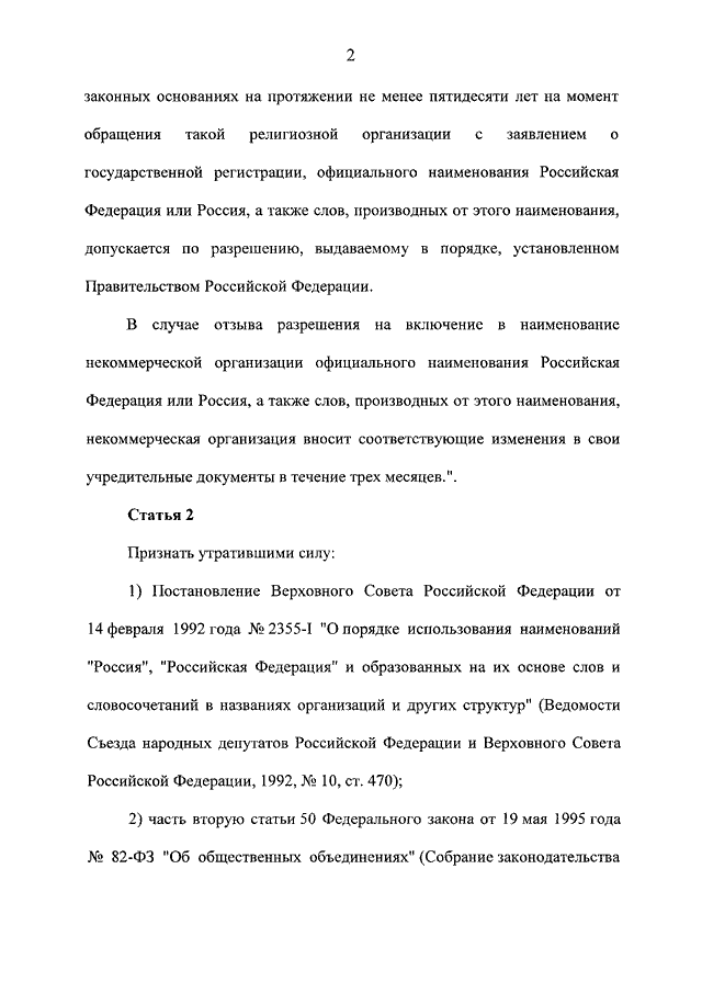 "О ВНЕСЕНИИ ИЗМЕНЕНИЯ В СТАТЬЮ 4 ФЕДЕРАЛЬНОГО ЗАКОНА "О НЕКОММЕРЧЕСКИХ ОРГАНИЗАЦИЯХ" И О ПРИЗНАНИИ УТРАТИВШИМИ СИЛУ ПОСТАНОВЛЕНИЯ ВЕРХОВНОГО СОВЕТА РОССИЙСКОЙ ФЕДЕРАЦИИ "О ПОРЯДКЕ ИСПОЛЬЗОВАНИЯ НАИМЕНОВАНИЙ "РОССИЯ", "РОССИЙСКАЯ ФЕДЕРАЦИЯ" И ОБРАЗОВАННЫХ НА ИХ ОСНОВЕ СЛОВ И СЛОВОСОЧЕТАНИЙ В НАЗВАНИЯХ ОРГАНИЗАЦИЙ И ДРУГИХ СТРУКТУР" И ЧАСТИ ВТОРОЙ СТАТЬИ 50 ФЕДЕРАЛЬНОГО ЗАКОНА "ОБ ОБЩЕСТВЕННЫХ ОБЪЕДИНЕНИЯХ"