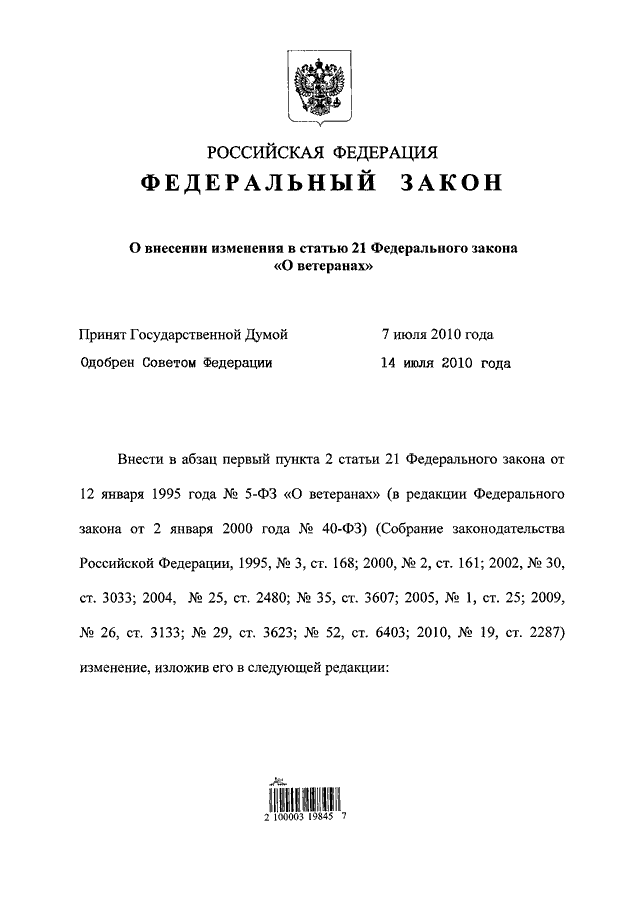 "О ВНЕСЕНИИ ИЗМЕНЕНИЯ В СТАТЬЮ 21 ФЕДЕРАЛЬНОГО ЗАКОНА "О ВЕТЕРАНАХ"