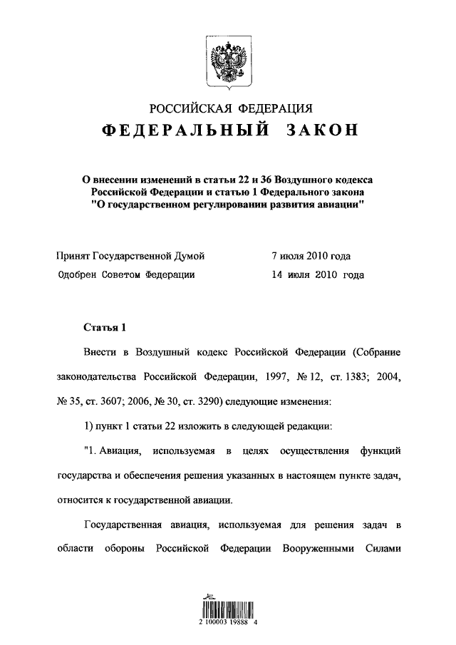 "О ВНЕСЕНИИ ИЗМЕНЕНИЙ В СТАТЬИ 22 И 36 ВОЗДУШНОГО КОДЕКСА РОССИЙСКОЙ ФЕДЕРАЦИИ И СТАТЬЮ 1 ФЕДЕРАЛЬНОГО ЗАКОНА "О ГОСУДАРСТВЕННОМ РЕГУЛИРОВАНИИ РАЗВИТИЯ АВИАЦИИ"