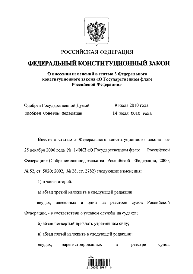 "О ВНЕСЕНИИ ИЗМЕНЕНИЙ В СТАТЬЮ 3 ФЕДЕРАЛЬНОГО КОНСТИТУЦИОННОГО ЗАКОНА "О ГОСУДАРСТВЕННОМ ФЛАГЕ РОССИЙСКОЙ ФЕДЕРАЦИИ"