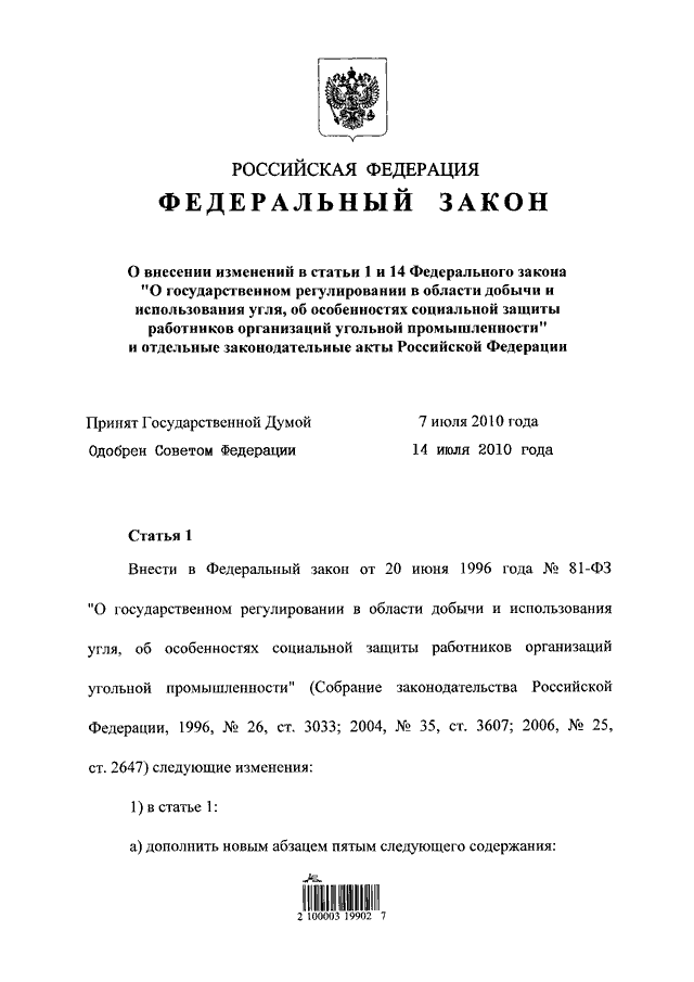 УГОЛЬНОЙ ПРОМЫШЛЕННОСТИ" И ОТДЕЛЬНЫЕ ЗАКОНОДАТЕЛЬНЫЕ АКТЫ