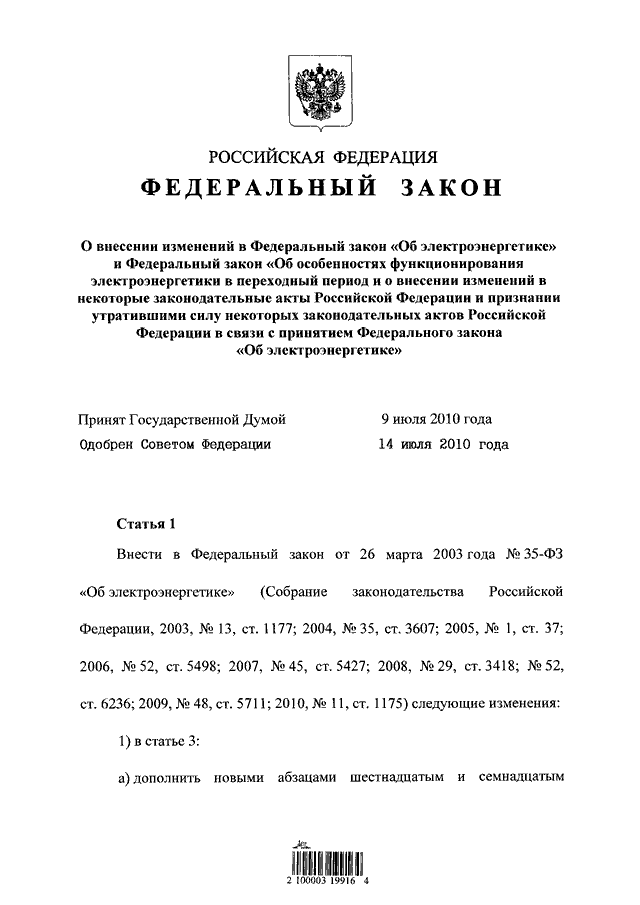 "О ВНЕСЕНИИ ИЗМЕНЕНИЙ В ФЕДЕРАЛЬНЫЙ ЗАКОН "ОБ ЭЛЕКТРОЭНЕРГЕТИКЕ" И ФЕДЕРАЛЬНЫЙ ЗАКОН "ОБ ОСОБЕННОСТЯХ ФУНКЦИОНИРОВАНИЯ ЭЛЕКТРОЭНЕРГЕТИКИ В ПЕРЕХОДНЫЙ ПЕРИОД И О ВНЕСЕНИИ ИЗМЕНЕНИЙ В НЕКОТОРЫЕ ЗАКОНОДАТЕЛЬНЫЕ АКТЫ РОССИЙСКОЙ ФЕДЕРАЦИИ И ПРИЗНАНИИ УТРАТИВШИМИ СИЛУ НЕКОТОРЫХ ЗАКОНОДАТЕЛЬНЫХ АКТОВ РОССИЙСКОЙ ФЕДЕРАЦИИ В СВЯЗИ С ПРИНЯТИЕМ ФЕДЕРАЛЬНОГО ЗАКОНА "ОБ ЭЛЕКТРОЭНЕРГЕТИКЕ"