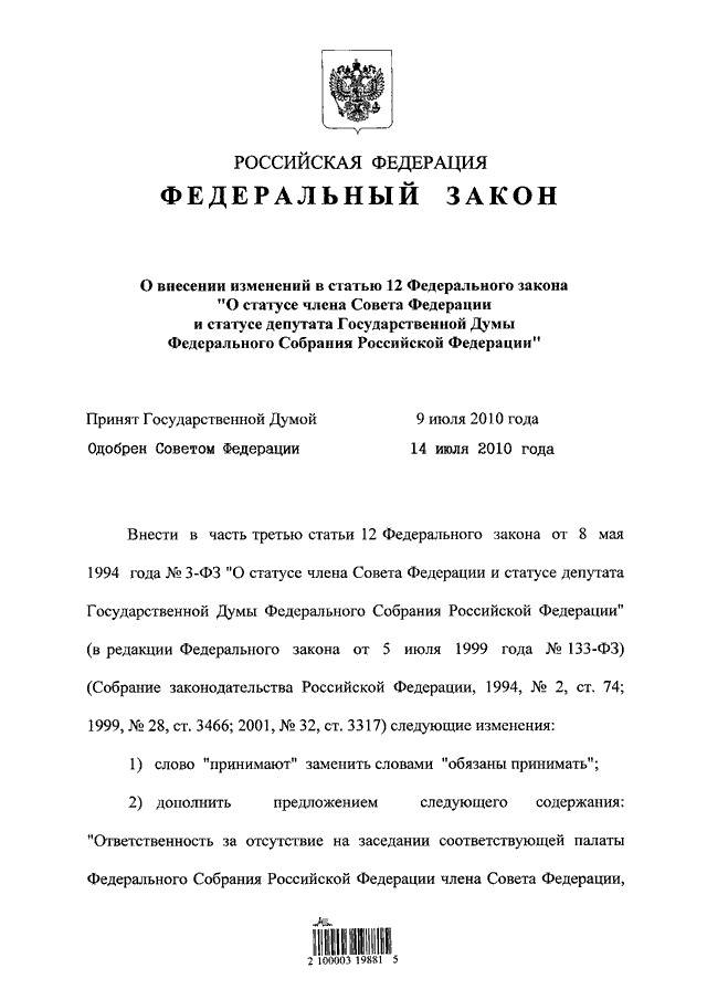 "О ВНЕСЕНИИ ИЗМЕНЕНИЙ В СТАТЬЮ 12 ФЕДЕРАЛЬНОГО ЗАКОНА "О СТАТУСЕ ЧЛЕНА СОВЕТА ФЕДЕРАЦИИ И СТАТУСЕ ДЕПУТАТА ГОСУДАРСТВЕННОЙ ДУМЫ ФЕДЕРАЛЬНОГО СОБРАНИЯ РОССИЙСКОЙ ФЕДЕРАЦИИ"