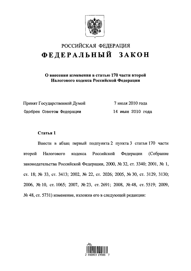 "О ВНЕСЕНИИ ИЗМЕНЕНИЯ В СТАТЬЮ 170 ЧАСТИ ВТОРОЙ НАЛОГОВОГО КОДЕКСА РОССИЙСКОЙ ФЕДЕРАЦИИ"