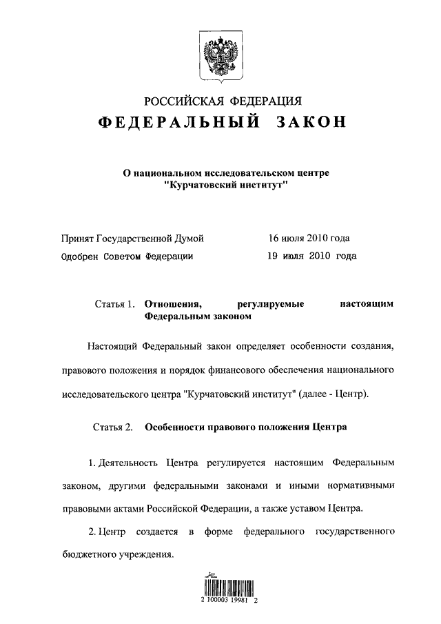 "О НАЦИОНАЛЬНОМ ИССЛЕДОВАТЕЛЬСКОМ ЦЕНТРЕ "КУРЧАТОВСКИЙ ИНСТИТУТ"