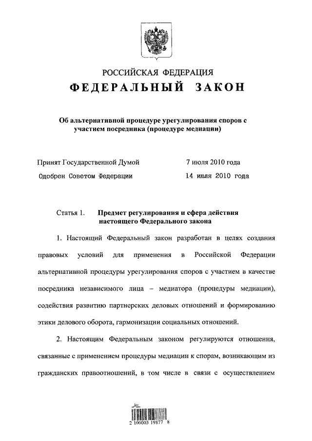 "ОБ АЛЬТЕРНАТИВНОЙ ПРОЦЕДУРЕ УРЕГУЛИРОВАНИЯ СПОРОВ С УЧАСТИЕМ ПОСРЕДНИКА (ПРОЦЕДУРЕ МЕДИАЦИИ)"