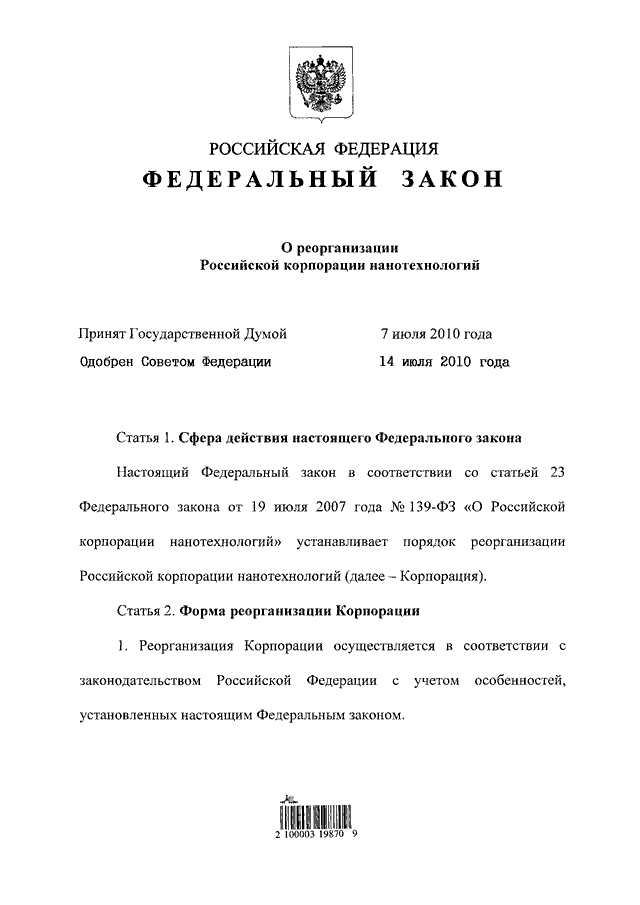 "О РЕОРГАНИЗАЦИИ РОССИЙСКОЙ КОРПОРАЦИИ НАНОТЕХНОЛОГИЙ"