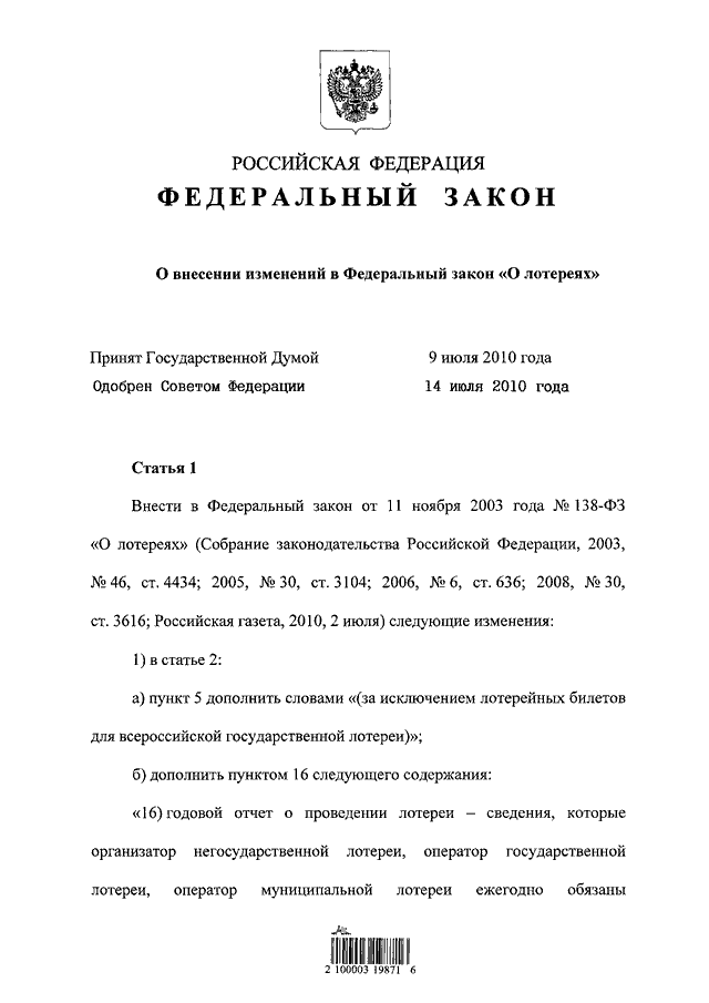 "О ВНЕСЕНИИ ИЗМЕНЕНИЙ В ФЕДЕРАЛЬНЫЙ ЗАКОН "О ЛОТЕРЕЯХ"