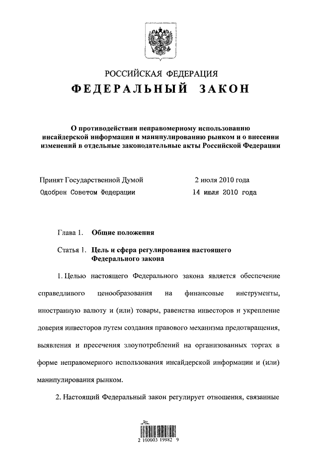 "О ПРОТИВОДЕЙСТВИИ НЕПРАВОМЕРНОМУ ИСПОЛЬЗОВАНИЮ ИНСАЙДЕРСКОЙ ИНФОРМАЦИИ И МАНИПУЛИРОВАНИЮ РЫНКОМ И О ВНЕСЕНИИ ИЗМЕНЕНИЙ В ОТДЕЛЬНЫЕ ЗАКОНОДАТЕЛЬНЫЕ АКТЫ РОССИЙСКОЙ ФЕДЕРАЦИИ"