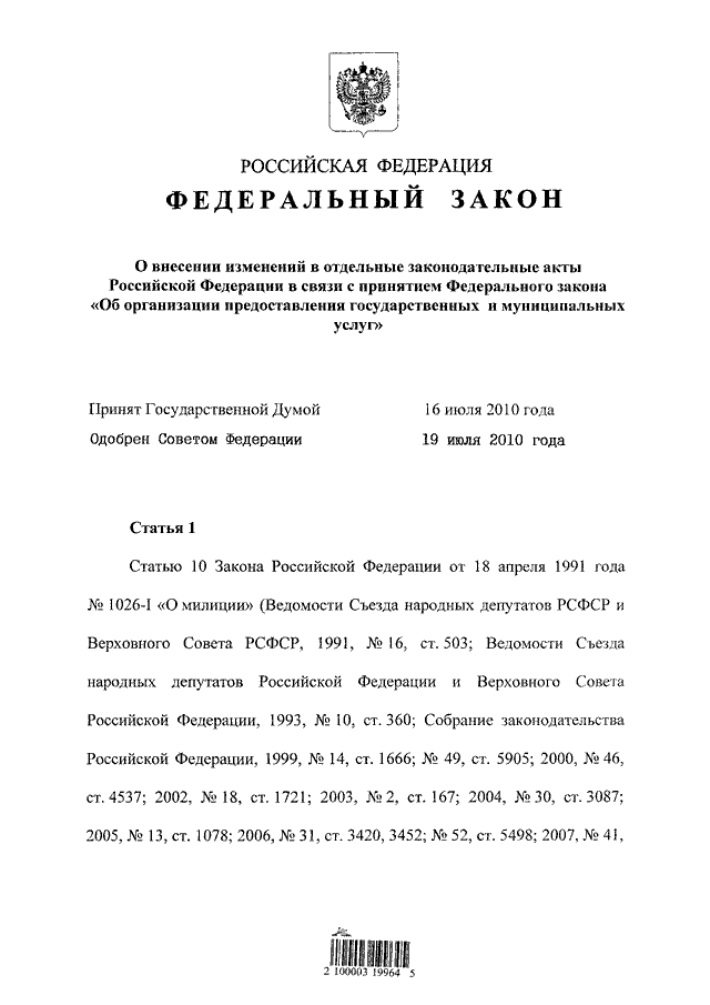 "О ВНЕСЕНИИ ИЗМЕНЕНИЙ В ОТДЕЛЬНЫЕ ЗАКОНОДАТЕЛЬНЫЕ АКТЫ РОССИЙСКОЙ ФЕДЕРАЦИИ В СВЯЗИ С ПРИНЯТИЕМ ФЕДЕРАЛЬНОГО ЗАКОНА "ОБ ОРГАНИЗАЦИИ ПРЕДОСТАВЛЕНИЯ ГОСУДАРСТВЕННЫХ И МУНИЦИПАЛЬНЫХ УСЛУГ"
