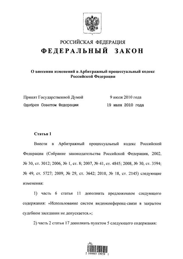 "О ВНЕСЕНИИ ИЗМЕНЕНИЙ В АРБИТРАЖНЫЙ ПРОЦЕССУАЛЬНЫЙ КОДЕКС РОССИЙСКОЙ ФЕДЕРАЦИИ"