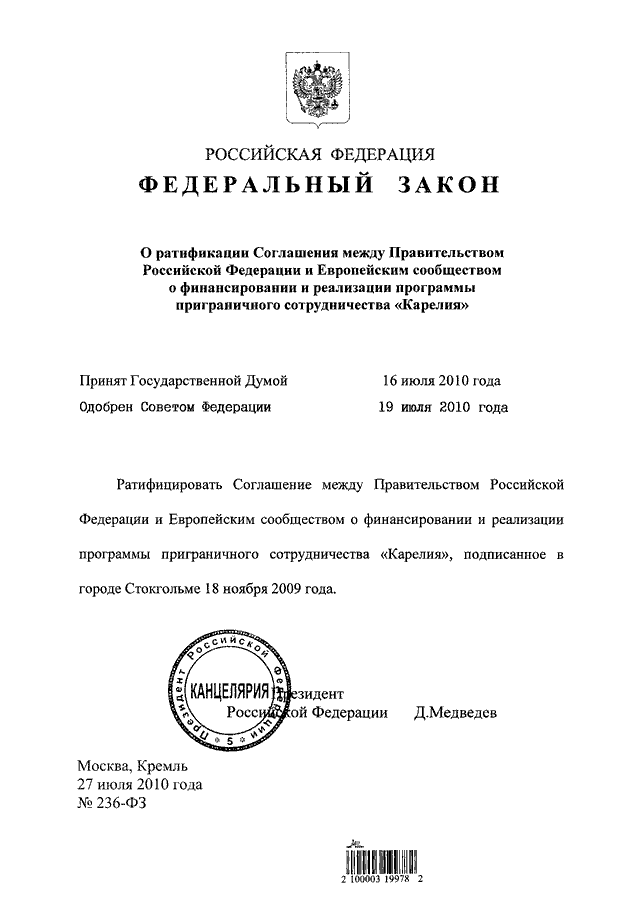 "О РАТИФИКАЦИИ СОГЛАШЕНИЯ МЕЖДУ ПРАВИТЕЛЬСТВОМ РОССИЙСКОЙ ФЕДЕРАЦИИ И ЕВРОПЕЙСКИМ СООБЩЕСТВОМ О ФИНАНСИРОВАНИИ И РЕАЛИЗАЦИИ ПРОГРАММЫ ПРИГРАНИЧНОГО СОТРУДНИЧЕСТВА "КАРЕЛИЯ"