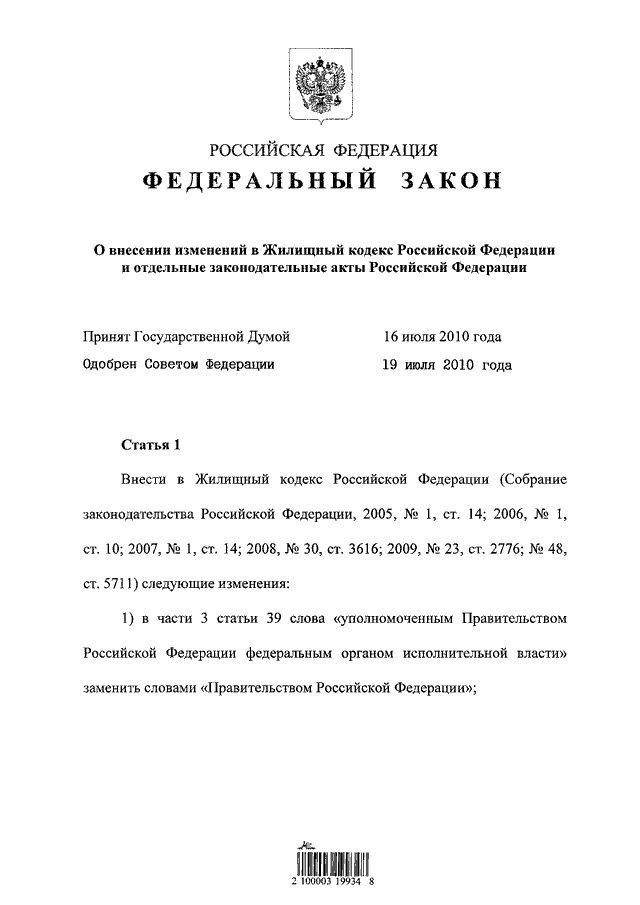 "О ВНЕСЕНИИ ИЗМЕНЕНИЙ В ЖИЛИЩНЫЙ КОДЕКС РОССИЙСКОЙ ФЕДЕРАЦИИ И ОТДЕЛЬНЫЕ ЗАКОНОДАТЕЛЬНЫЕ АКТЫ РОССИЙСКОЙ ФЕДЕРАЦИИ"
