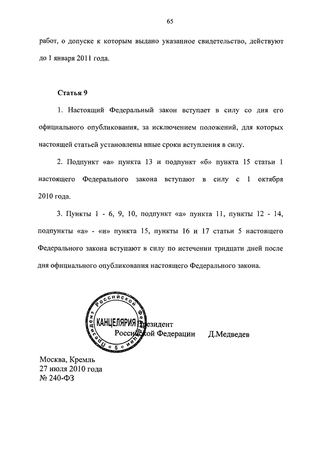 ФЕДЕРАЛЬНЫЙ ЗАКОН от 27.07.2010 N 240-ФЗ