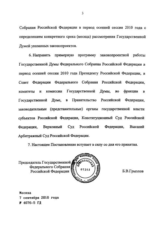 ПОСТАНОВЛЕНИЕ ГД ФС РФ от 07.09.2010 N 4076-5 ГД