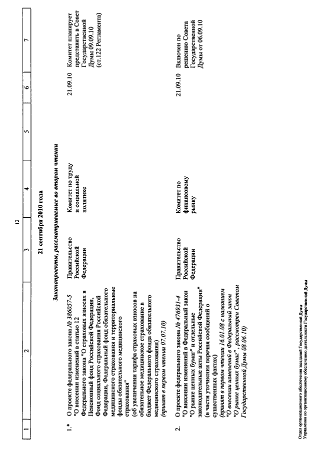 "О КАЛЕНДАРЕ РАССМОТРЕНИЯ ВОПРОСОВ ГОСУДАРСТВЕННОЙ ДУМОЙ С 7 ПО 24 СЕНТЯБРЯ 2010 ГОДА"