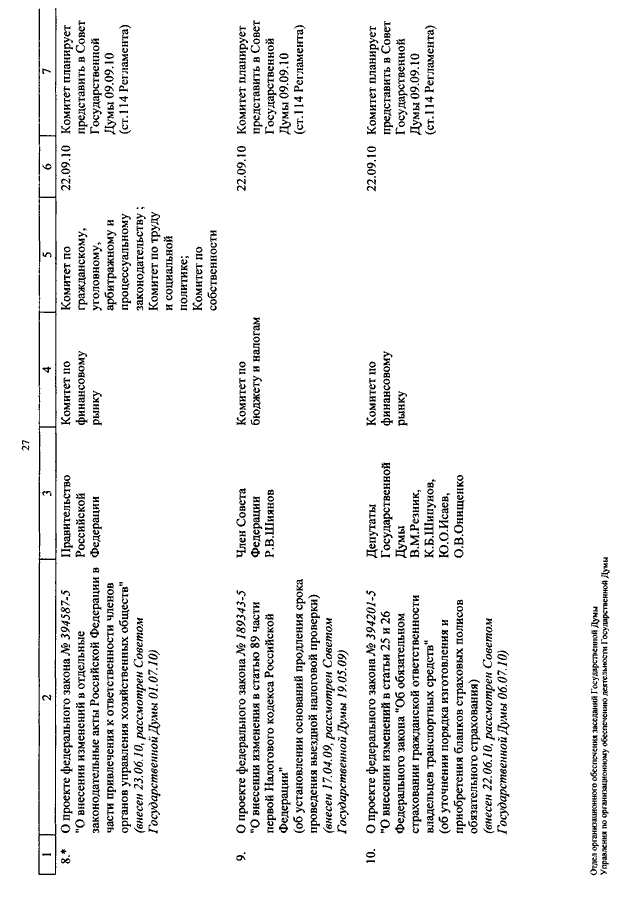 "О КАЛЕНДАРЕ РАССМОТРЕНИЯ ВОПРОСОВ ГОСУДАРСТВЕННОЙ ДУМОЙ С 7 ПО 24 СЕНТЯБРЯ 2010 ГОДА"