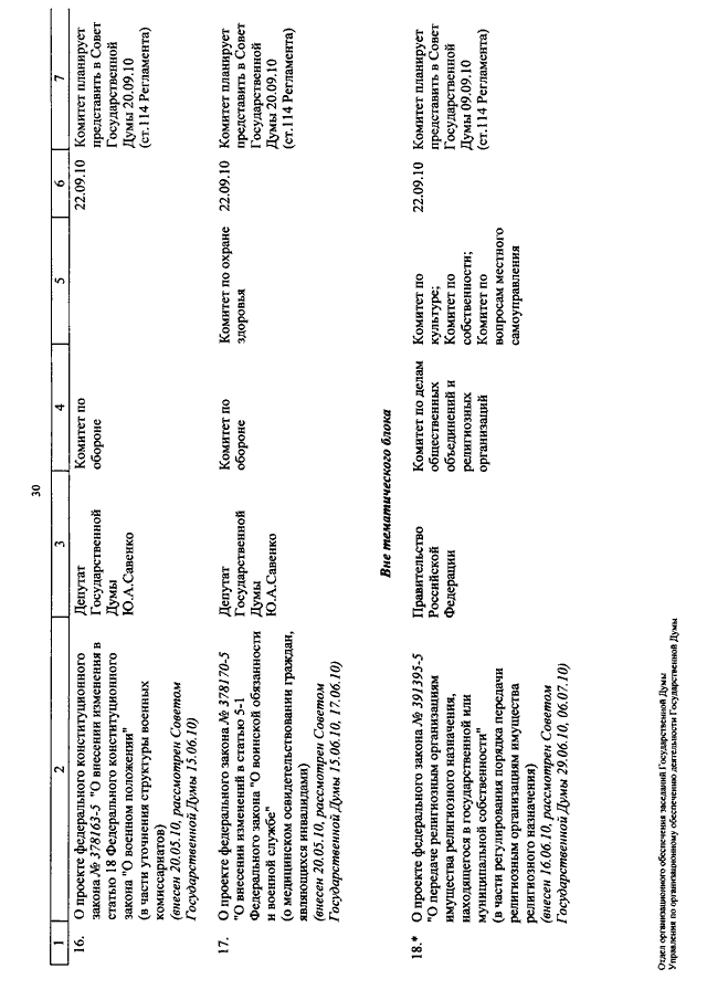 "О КАЛЕНДАРЕ РАССМОТРЕНИЯ ВОПРОСОВ ГОСУДАРСТВЕННОЙ ДУМОЙ С 7 ПО 24 СЕНТЯБРЯ 2010 ГОДА"