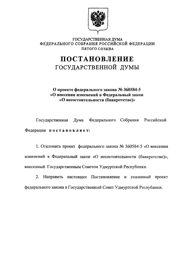 "О ПРОЕКТЕ ФЕДЕРАЛЬНОГО ЗАКОНА N 360584-5 "О ВНЕСЕНИИ ИЗМЕНЕНИЙ В ФЕДЕРАЛЬНЫЙ ЗАКОН "О НЕСОСТОЯТЕЛЬНОСТИ (БАНКРОТСТВЕ)"