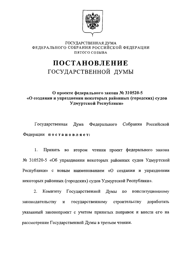 "О ПРОЕКТЕ ФЕДЕРАЛЬНОГО ЗАКОНА N 310520-5 "О СОЗДАНИИ И УПРАЗДНЕНИИ НЕКОТОРЫХ РАЙОННЫХ (ГОРОДСКИХ) СУДОВ УДМУРТСКОЙ РЕСПУБЛИКИ"