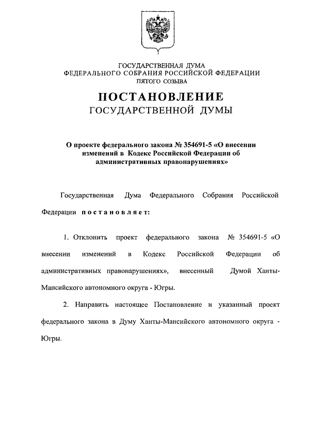 "О ПРОЕКТЕ ФЕДЕРАЛЬНОГО ЗАКОНА N 354691-5 "О ВНЕСЕНИИ ИЗМЕНЕНИЙ В КОДЕКC РОССИЙСКОЙ ФЕДЕРАЦИИ ОБ АДМИНИСТРАТИВНЫХ ПРАВОНАРУШЕНИЯХ"