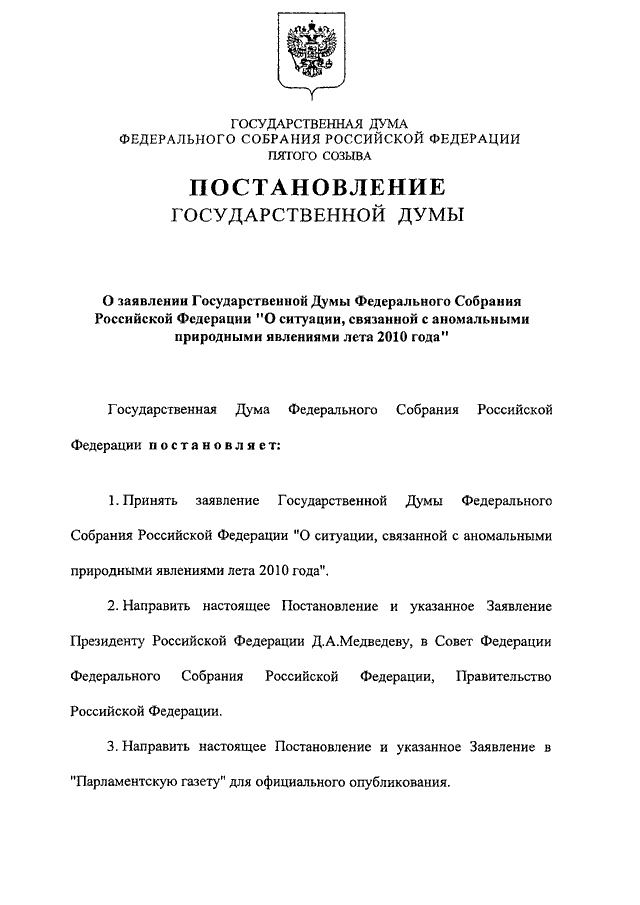 "О ЗАЯВЛЕНИИ ГОСУДАРСТВЕННОЙ ДУМЫ ФЕДЕРАЛЬНОГО СОБРАНИЯ РОССИЙСКОЙ ФЕДЕРАЦИИ "О СИТУАЦИИ, СВЯЗАННОЙ С АНОМАЛЬНЫМИ ПРИРОДНЫМИ ЯВЛЕНИЯМИ ЛЕТА 2010 ГОДА"