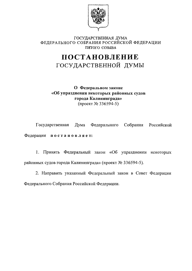 "О ФЕДЕРАЛЬНОМ ЗАКОНЕ "ОБ УПРАЗДНЕНИИ НЕКОТОРЫХ РАЙОННЫХ СУДОВ ГОРОДА КАЛИНИНГРАДА" (ПРОЕКТ N 336594-5)"