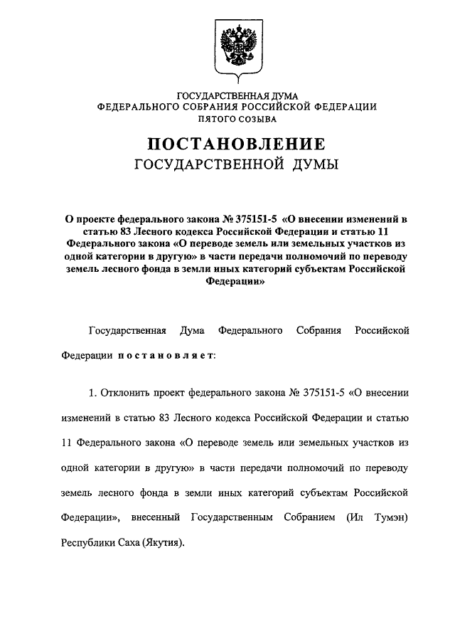 "О ПРОЕКТЕ ФЕДЕРАЛЬНОГО ЗАКОНА N 375151-5 "О ВНЕСЕНИИ ИЗМЕНЕНИЙ В