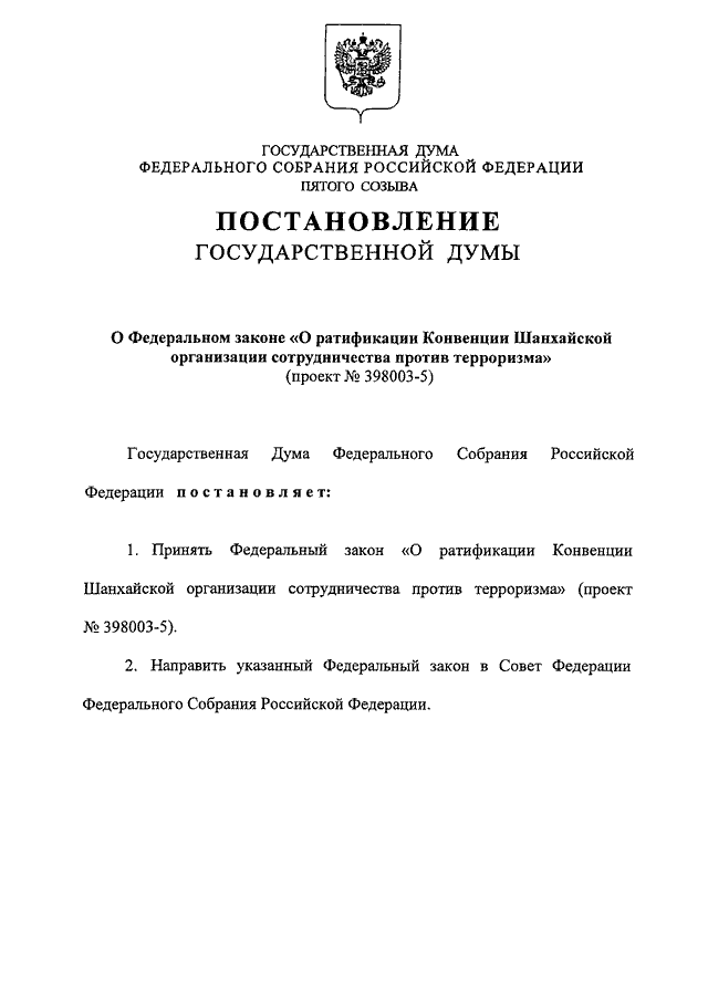 "О ФЕДЕРАЛЬНОМ ЗАКОНЕ "О РАТИФИКАЦИИ КОНВЕНЦИИ ШАНХАЙСКОЙ ОРГАНИЗАЦИИ СОТРУДНИЧЕСТВА ПРОТИВ ТЕРРОРИЗМА" (ПРОЕКТ N 398003-5)"