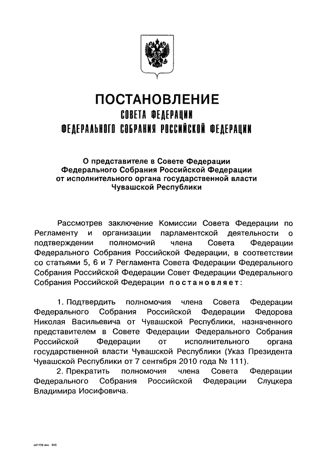 "О ПРЕДСТАВИТЕЛЕ В СОВЕТЕ ФЕДЕРАЦИИ ФЕДЕРАЛЬНОГО СОБРАНИЯ РОССИЙСКОЙ ФЕДЕРАЦИИ ОТ ИСПОЛНИТЕЛЬНОГО ОРГАНА ГОСУДАРСТВЕННОЙ ВЛАСТИ ЧУВАШСКОЙ РЕСПУБЛИКИ"