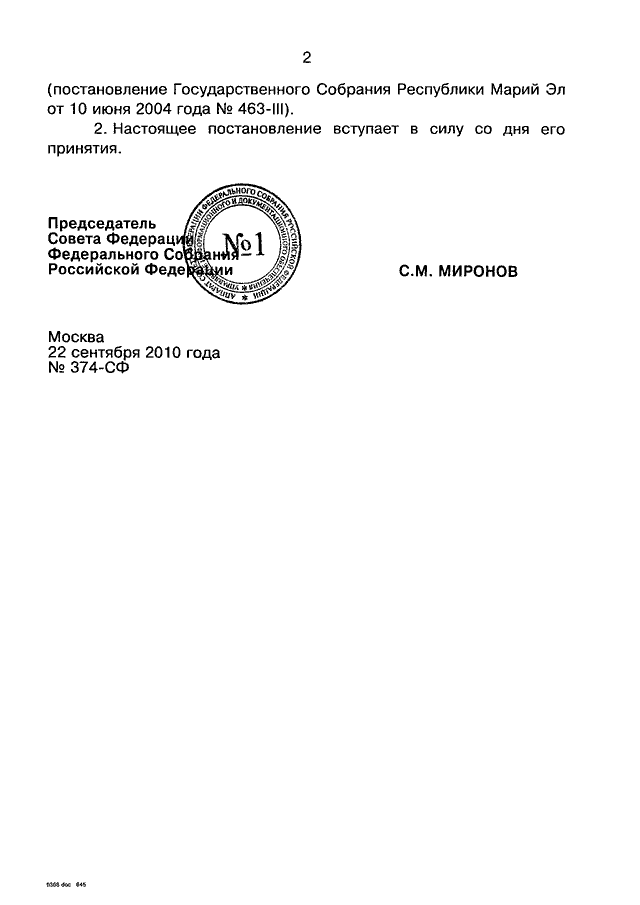 ПОСТАНОВЛЕНИЕ СФ ФС РФ от 22.09.2010 N 374-СФ
