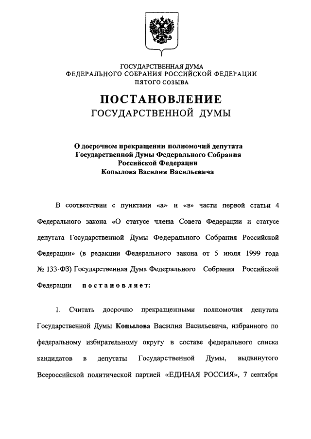 "О ДОСРОЧНОМ ПРЕКРАЩЕНИИ ПОЛНОМОЧИЙ ДЕПУТАТА ГОСУДАРСТВЕННОЙ ДУМЫ ФЕДЕРАЛЬНОГО СОБРАНИЯ РОССИЙСКОЙ ФЕДЕРАЦИИ КОПЫЛОВА ВАСИЛИЯ ВАСИЛЬЕВИЧА"