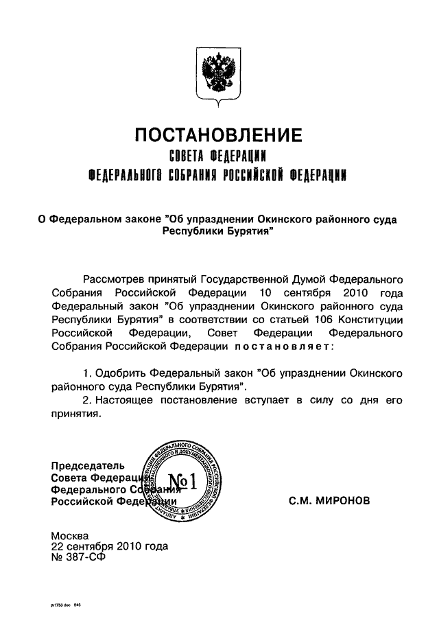 ПОСТАНОВЛЕНИЕ СФ ФС РФ от 22.09.2010 N 387-СФ