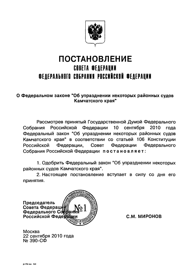 ПОСТАНОВЛЕНИЕ СФ ФС РФ от 22.09.2010 N 390-СФ